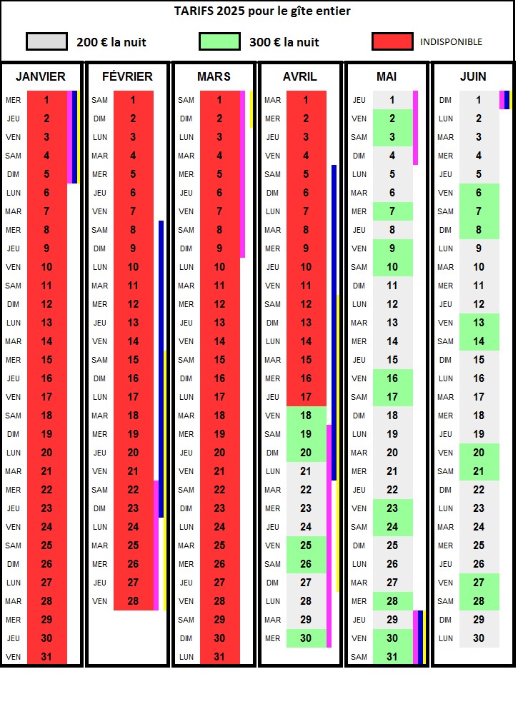 Calendrier des prix du gîte de groupes "Le Domaine Enchanté" en 2025